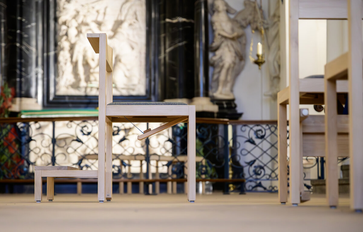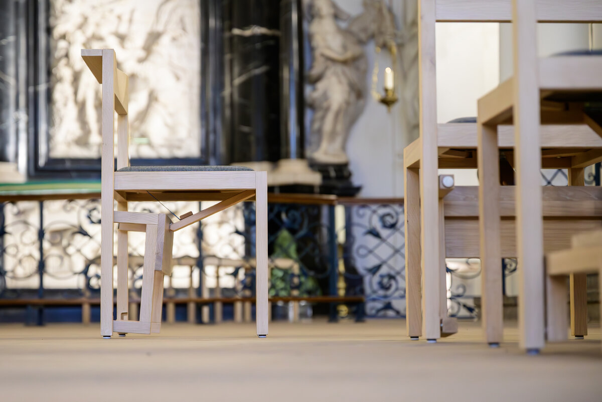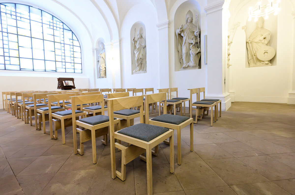 Nun hat diese ehrwürdige Stätte, auf Veranlassung des Bischöflichen Generalvikariats Fulda, neue stapelbare Lina Stühle in Eiche mit klapp- und entnehmbarer Kniebank, erhalten.