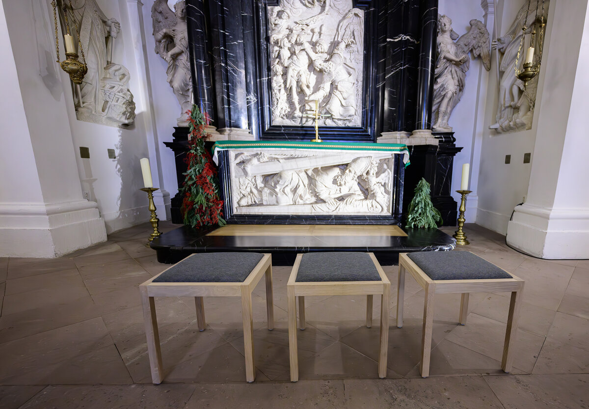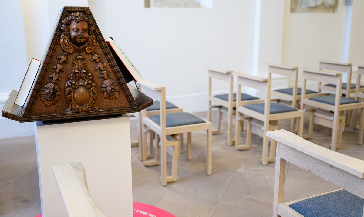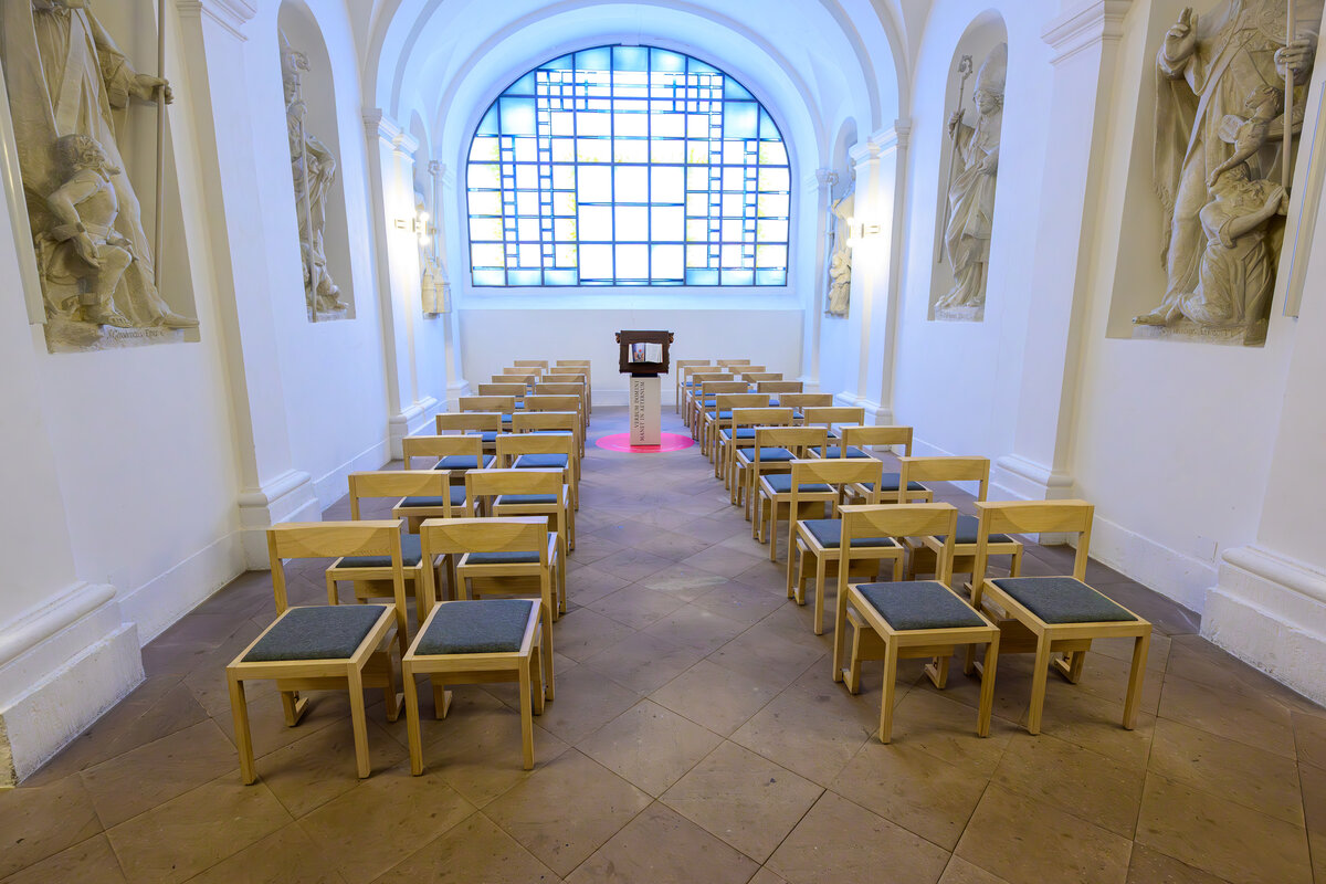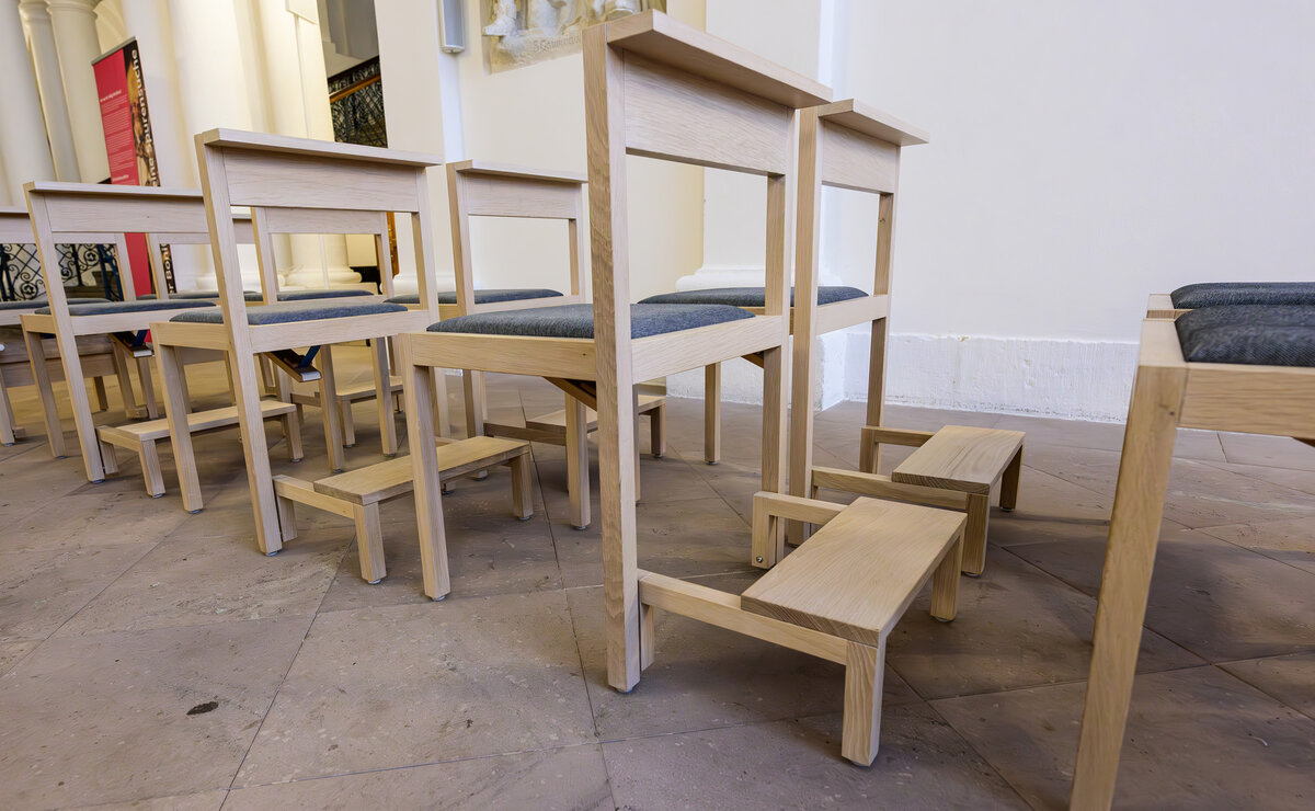 Nun hat diese ehrwürdige Stätte, auf Veranlassung des Bischöflichen Generalvikariats Fulda, neue stapelbare Lina Stühle in Eiche mit klapp- und entnehmbarer Kniebank, erhalten.